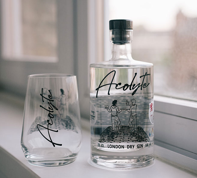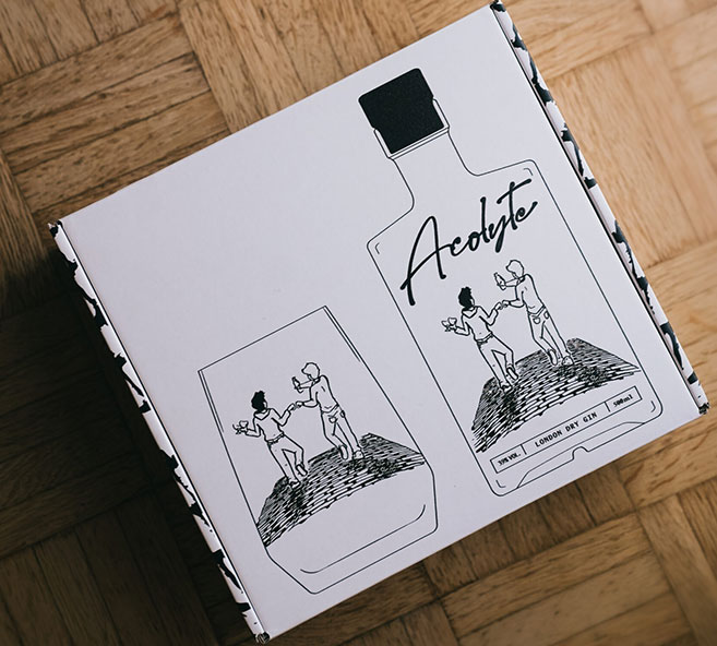 Acolyte-cadeauverpakking met een fles Acolyte-gin van 500 ml en het bijpassende zeefdrukglas, verpakt in een mooie geschenkdoos!